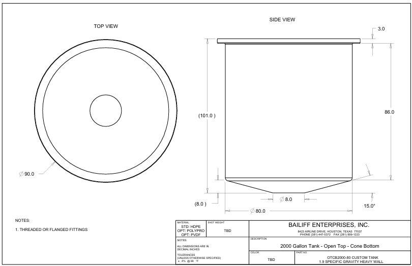 2000 GALLON POLYPROPYLENE FLAT TOP CONE BOTTOM TANK 2.2SG 80 INCH